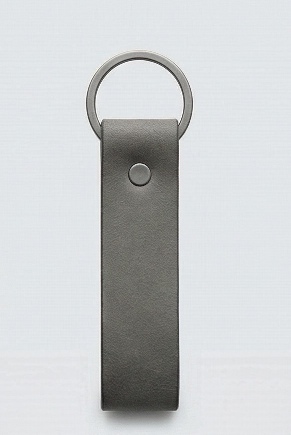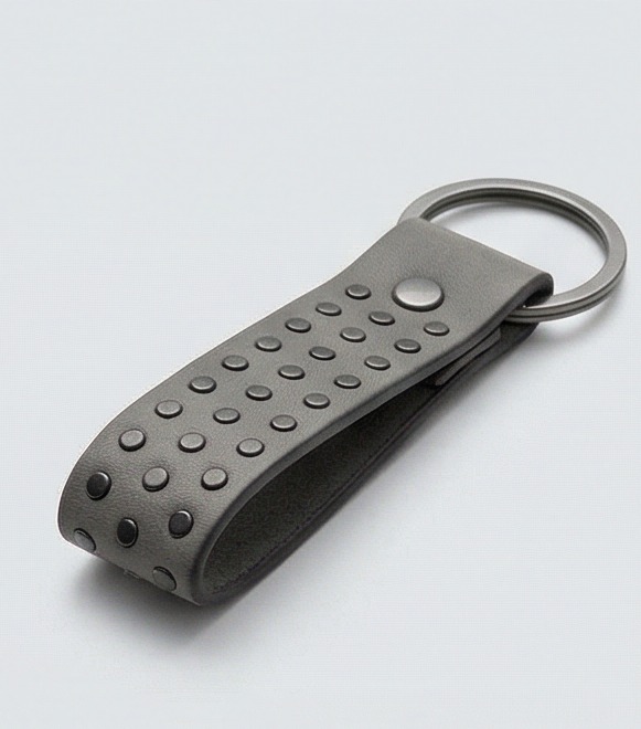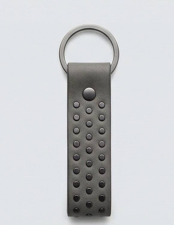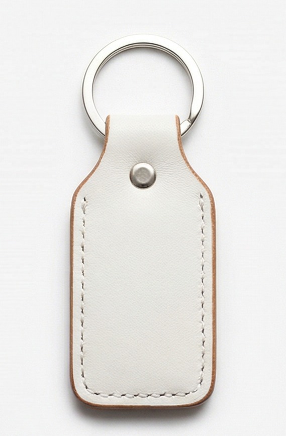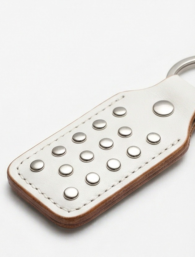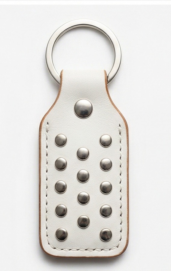 Upper: Handcrafted white and gray Leather stud keychain. Stylish, durable, and perfect for bags, keys, or gifting. Made with quality leather for a clean, elegant look.