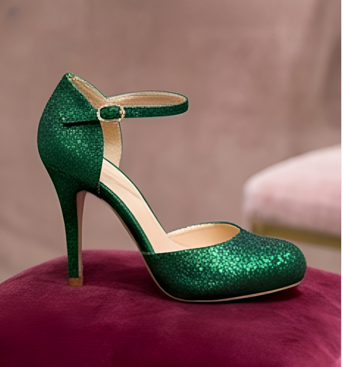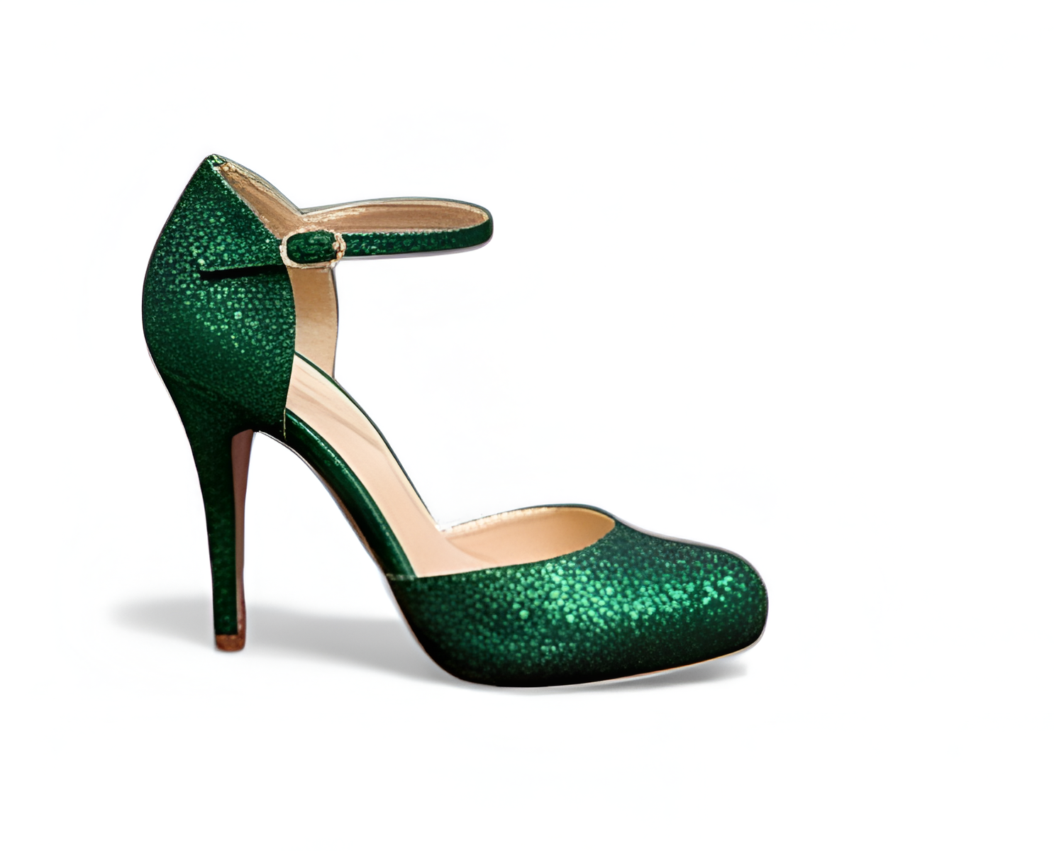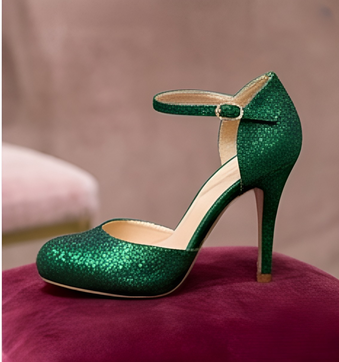 Crafted Leather Classic Women Green Glitter Ankle Strap Rounded Toe Dress Shoes