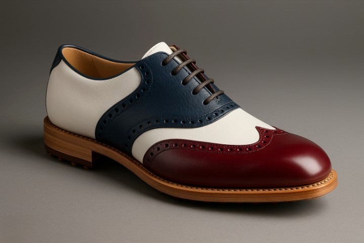 Crafted Leather Men’s Handcrafted Classic Leather Golf Saddle Shoes in White Burgundy and Blue