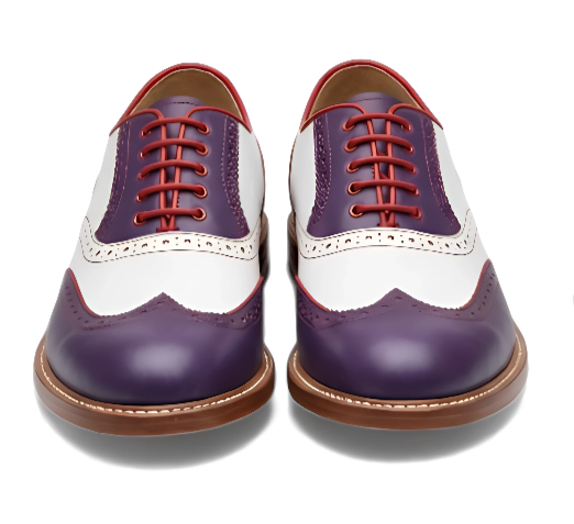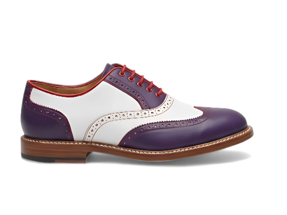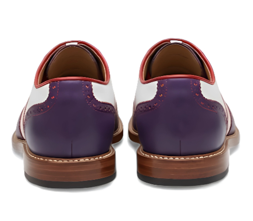 Crafted Leather Men’s Tri Color Saddle Golf Shoes in Purple Leather Base Red Accent Trim White Saddle Panel Wingtip Style