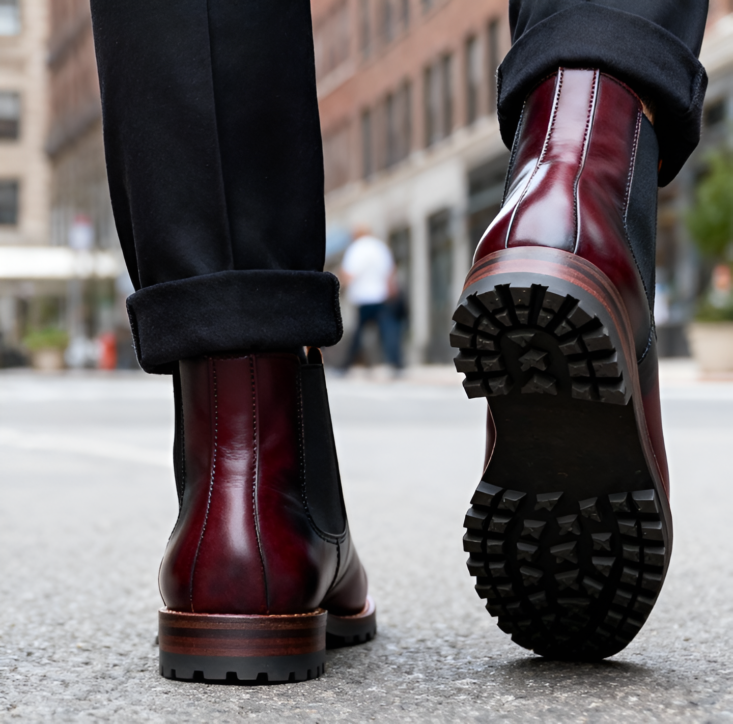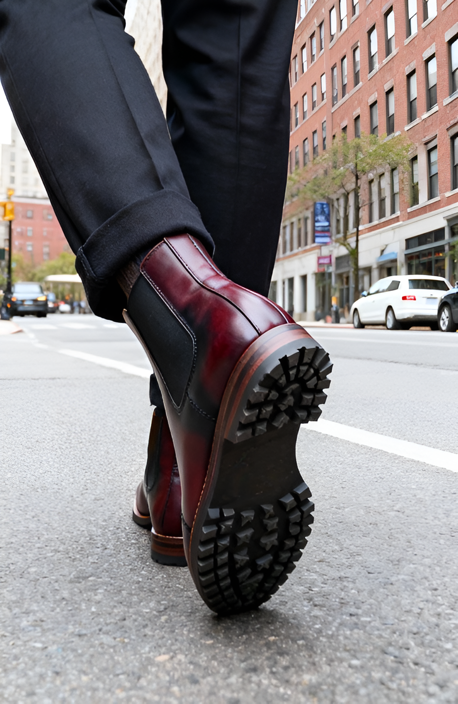 Crafted Leather Mens Burgundy Patina Black Shaded Leather Vibram Sole Chelsea Boot