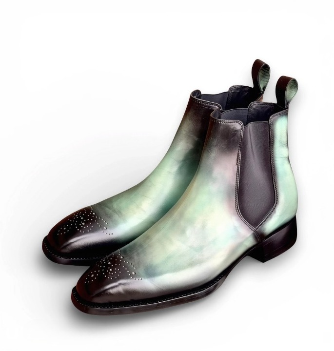 Crafted Leather Mens Designer Classic Green Cyan Patina Leather Chelsea Boot