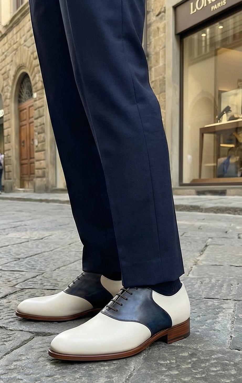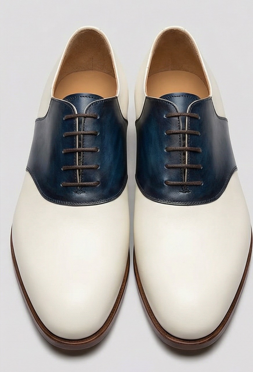 Crafted Leather Mens Designer Classic White Blue Patina Leather Saddle Golf Dress Shoes