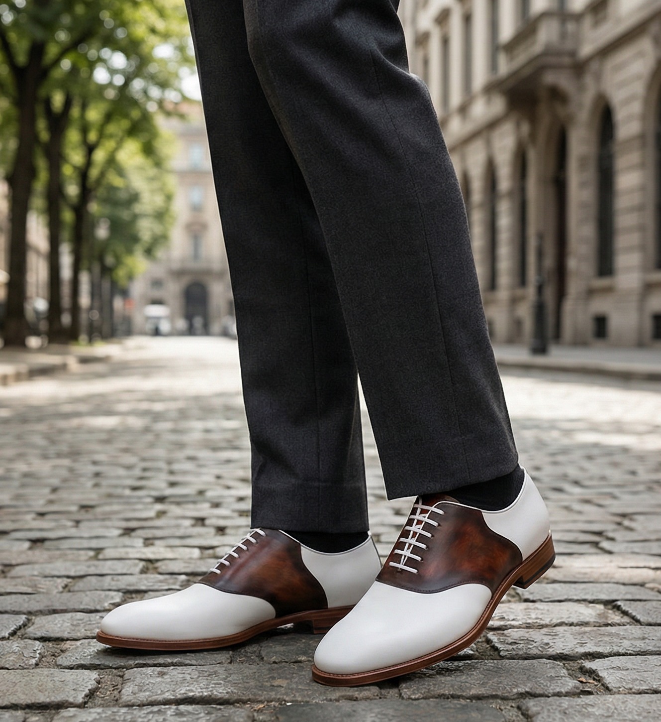 Crafted Leather Mens Designer Classic White Brown Patina Leather Saddle Golf Dress Shoes