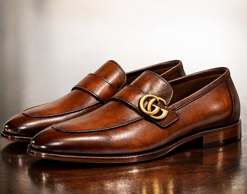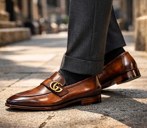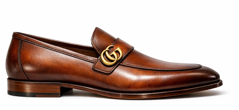 Crafted Leather Mens Designer Classic Brown Shaded Patina Leather Moccasin Loafers Dress Shoes