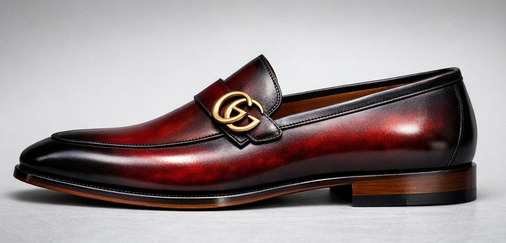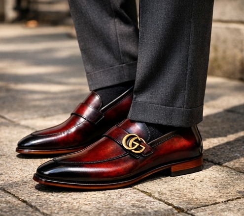 Crafted Leather Mens Designer Classic Luxury Burgundy Black Shaded Patina Leather Moccasin Loafers Dress Shoes