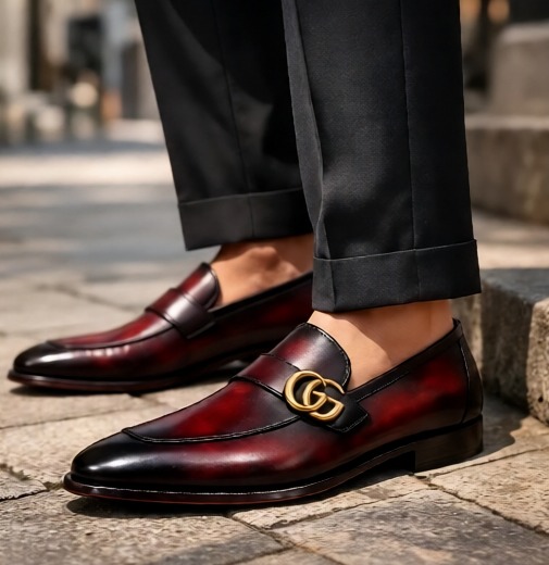 Crafted Leather Mens Designer Classic Luxury Red Black Shaded Patina Leather Moccasin Loafers Dress Shoes