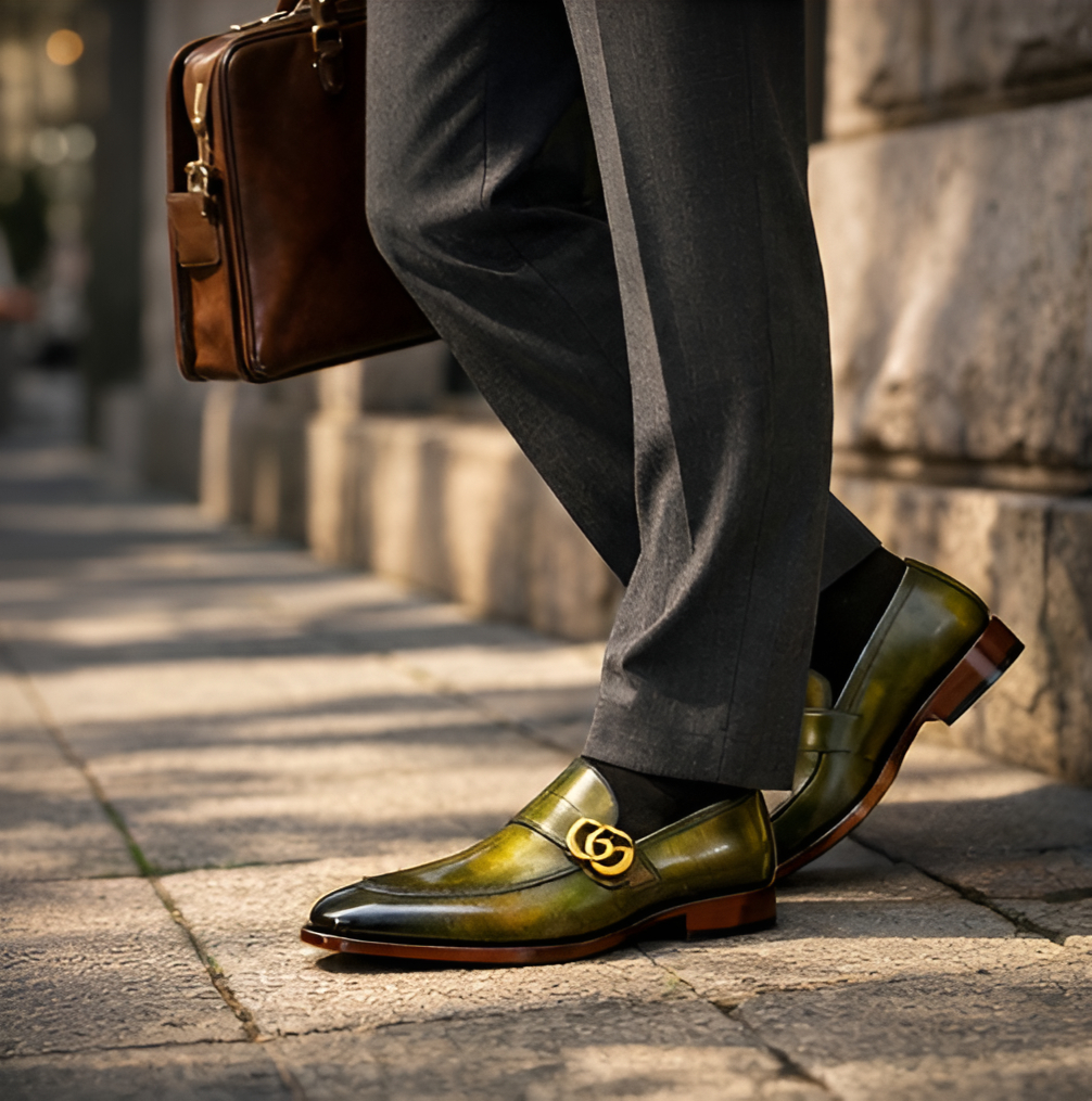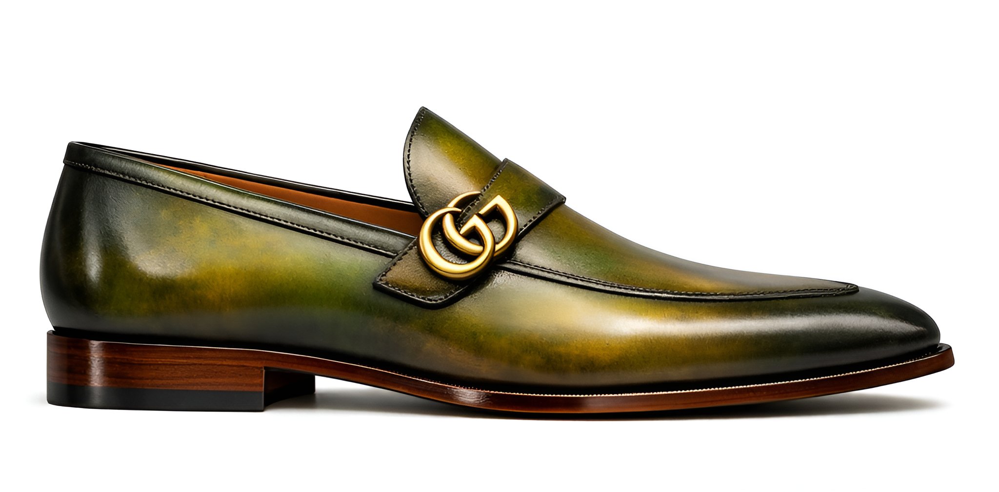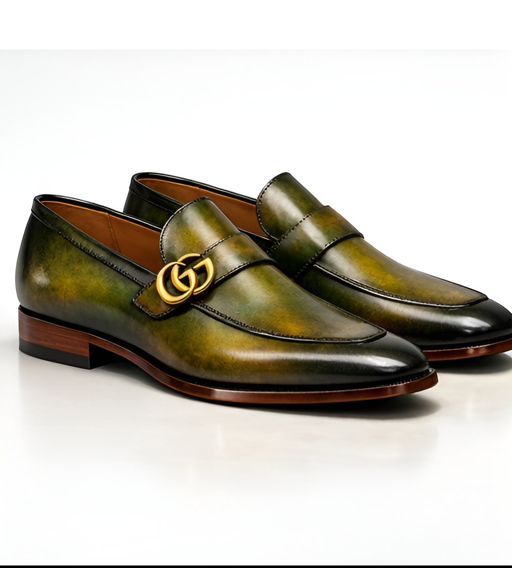Crafted Leather Mens Designer Classic Luxury Green Yellow Patina Leather Moccasin Loafers Dress Shoes